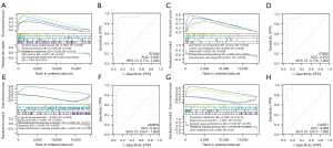 Figure 5 GSEA analysis and ROC curve analysis of upregulated hub genes. (A,B) Enrichment pathways and ROC curves of ITGAM. AUC =0.903. (C,D) Enrichment pathways and ROC curves of ITGB2. AUC =0.913. (E,F) Enrichment pathways and ROC curves of VAMP8. AUC =0.944. (G,H) Enrichment pathways and ROC curves of C3AR1. AUC =0.969. GSEA, gene set enrichment analysis; ROC, receiver-operating characteristic; AUC, area under the ROC curve; ES, Enrichment score; NP, NOM P-value; TPR, true positive rate; FPR, false positive rate.