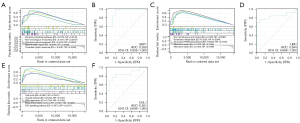 Figure 6 GSEA analysis and ROC curve analysis of downregulated hub genes. (A,B) Enrichment pathways and ROC curves of SKP1. AUC =0.938. (C,D) Enrichment pathways and ROC curves of UBC. AUC =0.844. (E,F) Enrichment pathways and ROC curves of CUL1. AUC =0.851. GSEA, gene set enrichment analysis; ROC, receiver-operating characteristic; AUC, area under the ROC curve; CUL1, cullin 1; ES, Enrichment score; NP, NOM P-value; TPR, true positive rate; FPR, false positive rate.