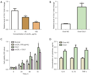 To determine an appropriate concentration of oxLDL in the AS model, we measured the relative expressions of CUL1 with 50 and 100 µg/mL in HUVECs. The latter had better efficiency (Figure 7A). Therefore, 100 µg/mL was chosen for the next assays. Then, over-CUL1 was transfected into HUVECs (Figure 7B). In CCK-8, it was found that oxLDL weakened cell viability compared with the normal group, CUL1 promoted cell proliferation in HUVECs, and CUL1 could inhibit cell proliferation in AS (Figure 7C). We also investigated the relationship between CUL1 and cytokines. The data showed that over-expressed CUL1 could elevate the concentrations of cytokines (Figure 7D).