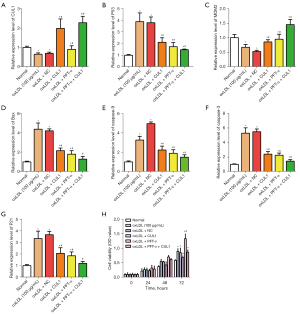 Figure 8 CUL1 inhibits the progression of AS by the p53 pathway. (A) Relative expression levels of CUL1 in each group were detected. (B-G) Expressions of the p53 (B), MDM2 (C), Bax (D), caspase-9 (E), caspase-3 (F), and p21 (G) pathways in each group. (H) CCK-8 demonstrated that PFT-α could promote cell growth in AS. *P<0.05 compared with normal; #P<0.05, ##P<0.01 compared with oxLDL. CUL1, cullin 1; AS, atherosclerosis; oxLDL, oxidized low-density lipoprotein; PET-α, pifithrin-α; NC, negative control; OD, optical density; CCK-8, cell counting kit-8.