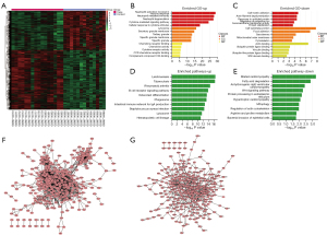 Figure 1 Visualization, functional enrichment, and PPI network analysis of DEGs. (A) Heatmap showing the expressions of DEGs in the case (red) and control groups (purple). (B,C) Gene Ontology enrichment analysis of upregulated and downregulated DEGs. (D,E) Enrichment pathways of upregulated and downregulated DEGs in Kyoto Encyclopedia of Genes and Genomes. (F,G) PPI network map of upregulated and downregulated DEGs. PPI, protein-protein interaction; DEGs, differentially expressed genes.