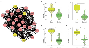 Figure 2 Screening of upregulated and downregulated hub genes. (A) Upregulated hub genes are shown in yellow. (B-E) Boxplots of ITGAM, ITGB2, VAMP8, and C3AR1 expression analyses. ***P<0.001. ITGAM, integrin subunit alpha M; ITGB2, integrin subunit beta 2; VAMP8, vesicle associated membrane protein 8; C3AR1, complement C3a receptor 1.