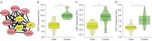 Figure 3 Screening of downregulated hub genes. (A) Downregulated hub genes are shown in yellow. (B-D) Boxplots of SKP1, UBC, CUL1 expression analyses. **P<0.01, ***P<0.001. SKP1, S-phase kinase associated protein 1; UBC, ubiquitin C; CUL1, cullin 1.