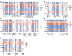 Figure 4 Heatmap of the correlation between the 7 hub genes and immune factors. Horizontal and vertical coordinates represent genes, and the different colors represent the correlation coefficient. Blue represents a positive correlation, and red represents a negative correlation. The darker the color, the stronger the correlation. *P<0.05, **P<0.01. Immune factors included (A) chemokine, (B) immunoinhibitor, (C) immunostimulator, (D) MHC molecule, (E) receptor. MHC, major histocompatibility complex.
