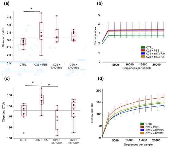 Alpha-diversity of the mice gut microbiota samples. (a) Based on average Shannon indices, or (b) Shannon indices shown as sequences per sample, the microbiota of the control (CTRL) samples was significantly less diverse than in the other groups. (c) The average operational taxonomic unit (out) richness and (d) the OTUs shown as sequences per sample of the C26 + PBS group gut microbiota tended to be higher than in other samples. Phosphate buffered saline (PBS), a systemic blocker of activin receptor 2B ligands (sACVR2B), Control (CTRL, n = 9), cancer (C26 + PBS, n = 7), the group that received sACVR2B until tumor formation (C26 + sACVR/b, n = 7), and the group that received sACVR2B until death (C26 + sACVR/c, n = 8). * Denotes statistically significant difference between the groups.