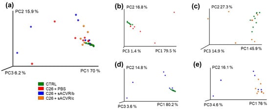 Beta-diversity of the mice microbiota samples. No clear differences were visually observed between the groups in principal component analysis (PCA) plot. (a) PCA plot of all groups; (b) PCA plot of groups CTRL and C26 + PBS; (c) PCA plot of groups CTRL and C26 + sACVR/c; (d) PCA plot of groups CTRL and C26 + sACVR/b; (e) PCA plot of groups C26 + sACVR/b and C26 + sACVR/c. Control (CTRL, n = 9), cancer (C26 + PBS, n = 7), the group that received sACVR2B until tumor formation (C26 + sACVR/b, n = 7), and the group that received sACVR2B until death (C26 + sACVR/c, n = 8).