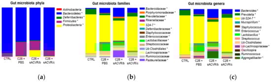 The gut microbiota composition of the mice at (a) phylum, (b) family, and (c) genus level. * Denotes significantly differing taxa between the CTRL and C26 + PBS group (False Discovery Rate (FDR) < 0.05). None of the sACVR administration protocols had significant effects (no difference compared to the C26 + PBS group). The gut microbiota compositions at the phylum level are shown on the left side, the family level in the middle, and the genus level on the right side. Control (CTRL, n = 9), cancer (C26 + PBS, n = 7), the group that received sACVR2B until tumor formation (C26 + sACVR/b, n = 7), and the group that received sACVR2B until death (C26 + sACVR/c, n = 8).