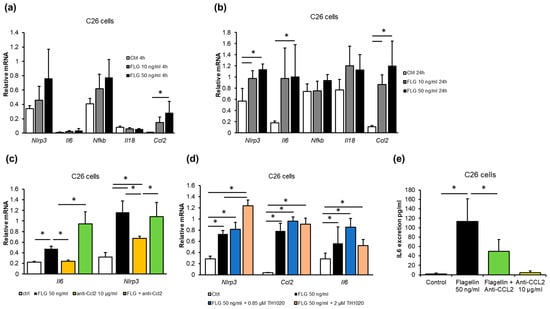 Flagellin exposure of C26 cancer cells (n = 4 per treatment) increased inflammation dose-dependently (a) after 4 h and (b) after 24 h. (c) The effects of flagellin on mRNA levels were not affected by blocking CCL2 with neutralizing antibody (anti-CCL2) or (d) TLR5 antagonist TH1020 (n = 4 per treatment). (e) Flagellin exposure increased IL6 excretion from C26 cells that was blocked by CCL2-neutralizing antibody (n = 4 per treatment). * Denotes a statistically significant difference between the groups that are connected with the line. Ctrl, control; FLG, flagellin.