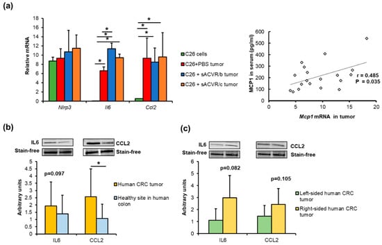 (a) Compared to the non-implanted C26 cancer cells, mouse C26 tumors expressed more CCL2 and IL6, independent of the sACVR treatment. The expression of CCL2/MCP-1 in the tumors was associated with the level of MCP-1 in sera. (b) Human CRC tumors (n = 13) expressed more CCL2 than the healthy colon sites. (c) The right-sided tumors (n = 6) tended to have higher expression levels of IL6 and CCL2 than the left-sided tumors (n = 7). * Denotes a statistically significant difference between the groups that are connected with lines. Control (CTRL, n = 9), cancer (C26 + PBS, n = 7), the group that received sACVR2B until tumor formation (C26 + sACVR/b, n = 7), and the group that received sACVR2B until death (C26 + sACVR/c, n = 8).