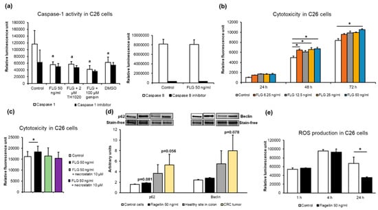 Cancer cells that manage to evade apoptosis tend to undergo necrosis or necroptosis and autophagy that can promote tumor growth and survival []. Necrosis is associated with unprogrammed cell death resulting from cellular damage or infiltration by pathogens, while necroptosis is programmed via NOD-like receptors and RIP-kinases []. We therefore sought to determine whether the prolonged exposure of C26 cells to different concentrations of flagellin increased cytotoxicity, and whether RIP-kinases were involved. Compared to the controls, 6.25, 25 and 50 ng/mL of flagellin increased cytotoxicity at 24 h and 50 ng/mL at 72 h (p < 0.05 for all, Figure 7b). To evaluate whether RIP-kinases were involved in the cytotoxicity, the cells were treated with 50 ng/mL of flagellin together with the RIP-kinase inhibitor necrostatin. The addition of necrostatin did not affect the cytotoxicity (Figure 7d), indicating that the flagellin-induced cell death was likely necrotic and not necroptotic. To assess the expression of autophagy-related proteins, we determined the expression levels of Beclin and p62, which would link the autophagy pathway to the ubiquitin–proteasome system []. Unfortunately, microtubule-associated protein light chain 3 (LC3) and Ser757-phosphorylated Unc-51-Like Autophagy Activating Kinase 1 (ULK) could not be reliably detected. Though not statistically significant, flagellin exposure of C26 cells tended to increase p62 (p = 0.08, Figure 7c), and human CRC tumors tended to express more p62 and Beclin than the healthy colon sites (p = 0.056 and 0.078, respectively, Figure 7c). Finally, flagellin exposure for 24 h decreased the levels of ROS in C26 cells (p = 0.021, Figure 7d). Altogether, these results indicate that flagellin inhibited caspase-1 activity and production of ROS, and increased necrosis in C26 cancer cells.