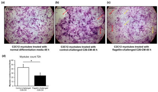 (a) Compared to the C2C12 murine myotubes growing in normal differentiation media and (b) conditioned media of the C26 cells with control challenge, (c) the conditioned media of the flagellin-challenged C26 cells deteriorated and dedifferentiated the multinucleated myotubes into mononucleated myoblasts after 48 h of exposure. The images are hematoxylin & eosin stainings at 4× magnification. The scale bar is 0.5 mm. Red arrows point to the field where myotubes are detached. Yellow arrows point to areas where the myotubes are dedifferentiated. (d) Compared to the exposure with the conditioned media of vehicle-treated C26 cells (control), the media of flagellin-treated cells decreased the number of C2C12 myotubes after 72 h of exposure. The scoring of myotubes vs. dedifferentiated myoblasts was based on whether they were multinucleated or mononucleated, respectively. The number of myotubes in each coverslip was counted manually using three to five (depending on the extent of detachment of myotubes) random fields that with 4× magnification, which practically covered the entire coverslip. CM = conditioned media. * Denotes statistically significant difference.
