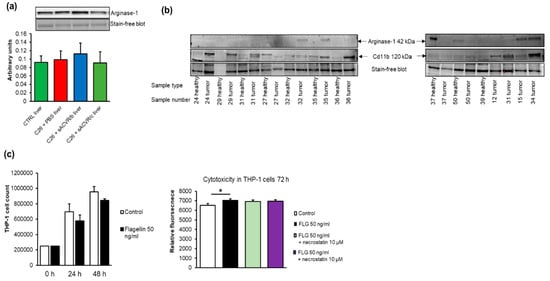 (a) In murine livers, no differences between the groups were found in the expression of M2-type macrophage marker Arginase-1. (b) Cd11b+ was found in 66% of the human tumors, with a greater prevalence in left-sided than right-sided tumors, and Arginase-1 was detected in 30% of the tumors. (c) Flagellin exposure started to decrease the number of THP-1 cells after 24 h, resulting in increased cytotoxicity at 72 h that was not affected by necrostatin. The blots were cut horizontally into two parts to analyze Arginase-1 and Cd11b from the same run. The original blots and the quantified intensities of the bands are provided in the Supplemental file. * Denotes a statistically significant difference between the groups that are connected with line. FLG = flagellin; control (CTRL, n = 9), cancer (C26 + PBS, n = 7), the group that received sACVR2B until tumor formation (C26 + sACVR/b, n = 7), and the group that received sACVR2B until death (C26 + sACVR/c, n = 8).