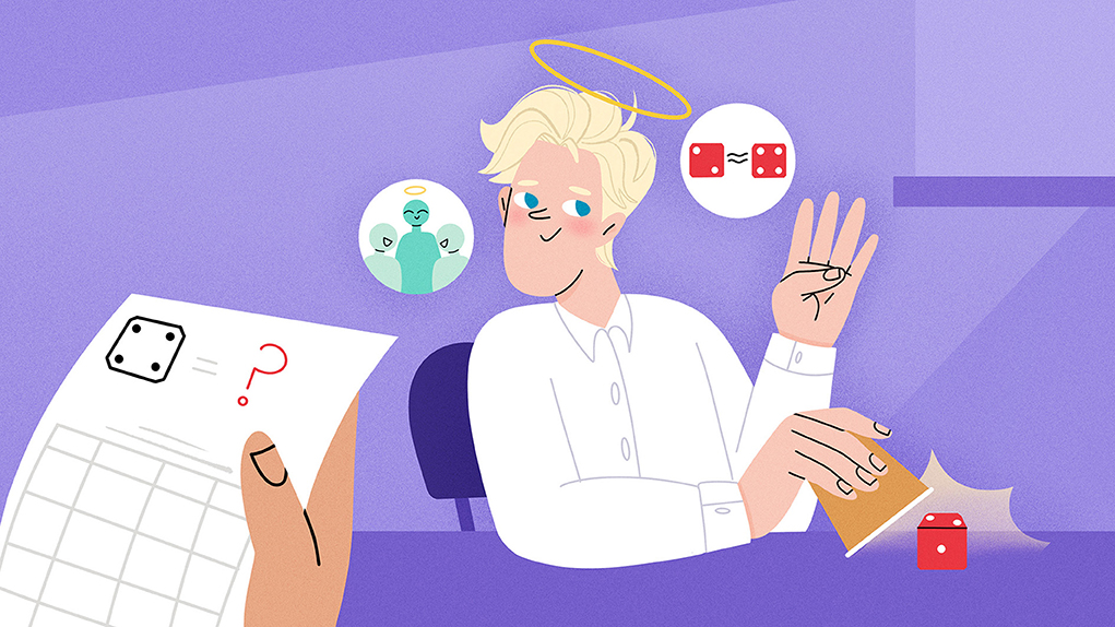 Illustration of a person with a halo, seated at a table with a die that landed on a 2, showing with their hand that...