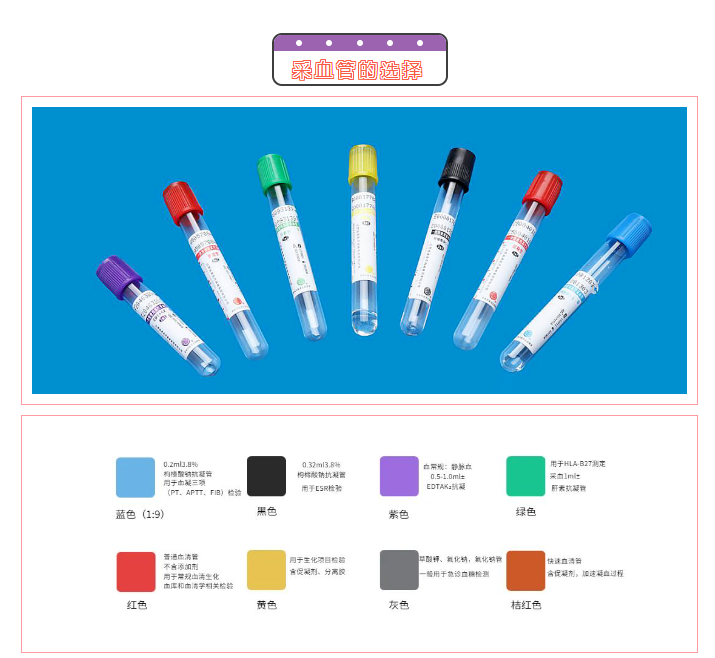 紫色头盖:又叫EDTA抗凝管,一般是用于普通的血液学检测,但是不适用于凝血实验及血小板功能的检测,也不能用于钠、钾、钙、铁、碱性磷酸等的测定;