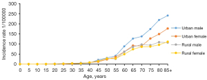 The age-specific incidence of lung cancer by area and sex is shown in Figure 2. The incidence of lung cancer increased with age in Henan province in 2018. It was relatively low in the 0–39-year age group, then increased dramatically and reached its peak in the 85+ years age group for both sexes. The pattern was similar between urban and rural areas. In the above 40-year age groups, the incidence was higher in males than females in both urban and rural areas.
