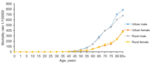 The age-specific mortality rates for lung cancer by area and sex are set out Figure 3. The lung cancer mortality rate increased with age in Henan province in 2018. It was relatively low in the 0–44-year age group, then increased dramatically and reached its peak in the 85+ years age group for both sexes. The pattern was similar between urban and rural areas. In the above 45-year age group, males had a higher mortality rate than females in both urban and rural areas.