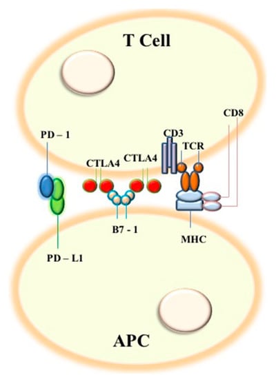 Schematic representation of principal interactions targeted by immune checkpoints inhibitors, including PD-1 (programmed cell death protein) and PD-L1 (programmed cell death ligand 1 protein), CTLA4 (cytotoxic T-lymphocyte antigen 4), B7-1, TCR and MHC (major histocompatibility complex) (with the co-function of CD3 and CD8 molecules) pathways, between T-lymphocytes (T cells) and antigen presenting cells (APCs).