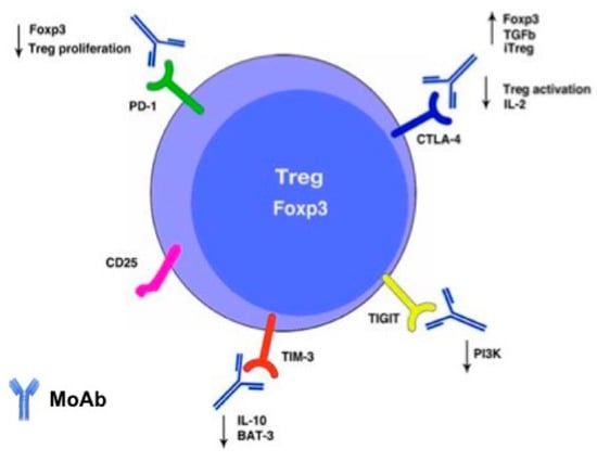 Treg cells, differing from effector T cells, constitutively express CTLA-4, and that contributes to their suppressive function. Although the depletion of Tregs through the binding of CTLA4 has been thought to be a main mechanism of action of such an antibody in immunotherapy, several lines of evidence show that there is no change of Treg number in tumors upon immunotherapy with antiCTLA4, despite the efficacy of the treatment []. Therefore, it is likely that the major effect of the antiCTLA4 therapy is the impairment of Treg activation, following CTLA4 engagement. As a consequence, the impairment of T cell functions leads to the reactivation of antitumor T cell responses previously downregulated by Treg activity. Treg cells preferentially bind to activating costimulatory molecules, inducing their downregulation on APC surface, thus contributing to reducing the activation of effector T cells [,,]. Once activated, CTLA-4 can inhibit cell stimulation through different mechanisms; besides the competition with CD28 for binding to B7.1/B7.2, signaling through CTLA4 can also inhibit IL-2 mRNA production or promote the expression of molecules associated to cell cycle arrest or inhibit the nuclear factors factor κB (NF-κB), nuclear factor of activated T cells (NF-AT) and activator protein 1 (AP-1) [,]. In Treg cells, CTLA-4 seems to be associated with the upregulation of FoxP3; indeed, the activation of this marker increases TGF-β production, which in turn promotes FoxP3 expression []. This mechanism is also implicated in the conversion of peripheral CD4+CD25− naive T cells to CD4+CD25+ regulatory T cells, thus enhancing immune suppression [,]. PD-1 is known to inhibit T cells’ proliferation and effector functions and is also expressed on the Treg’s surface. Differing from effector cells, PD-1 expressed on Tregs contributes towards promoting immune suppression, stimulating their proliferation. Moreover, the PD-1 ligand, PD-L1, can induce Foxp3 expression []. PD-L1 is associated with the inhibition of AKT/mTOR pathways and expanding iTregs [,]. Acting differently from CTLA-4, PD-1 is activated during the effector phase of T cells’ activation; after TCR stimulation and the binding of PD-1 with PD-L1, the cytoplasmic tail of PD-1 is phosphorylated and recruits the phosphatases SHP-1 and SHP-2, which dephosphorylate the molecules downstream of the TCR, such as ZAP-70 and LCK. Within the TME, those mechanisms are associated with cancer proliferation due to their effects on signaling pathways determining cytokine production, and T effector cells’ proliferation and survival [,,]. Besides PD-1 and CTLA-4, several other inhibitory molecules expressed on Tregs are candidates to be targeted to improve anticancer therapies. In the last few years, particular interest has been directed to the IC TIM-3 as a good target for new lung cancer immunotherapies [,,]. This molecule plays a key role in the inhibition of Th1 responses and the expression of cytokines such as TNF and INF-γ. TIM-3+ Treg cells are associated with more aggressive forms of tumors, producing more IL-10, granzyme and perforin [,]. In the absence of TIM-3 ligand galectin-9, the five tyrosine residues of TIM-3 cytoplasmic tail are phosphorylated and bind HLA-B associated transcript 3 (Bat-3). In that condition, TIM-3 can also promote effector T cell activity. When galectin-9 binds to TIM-3 instead, bat-3 is released and promotes inhibitory signals associated with programmed cell death, the suppression of Th1 and Th17 responses and the induction of tolerance []. TIGIT is an ICI expressed on some Treg subsets and intervenes especially in the suppression of Th1 and Th17 lymphocytes. it was found that TIGIT-positive Tregs have a potent immunosuppressive action and seem to produce higher levels of IL-10 [,]. The exact pathway associated with the inhibitory activity of TIGIT is not completely clear. It is known that it has a cytoplasmic tail containing an ITIM and an ITT motif and their phosphorylation is correlated to T cell inhibition. When the ligand CD155 binds to TIGIT, the phosphatase SHIP1, associated with blocking the signal transduction of PI3K and MAPK pathways, is recruited []. TIGIT promotes immune suppression and interferes with T effector cells’ activation and proliferation, downregulating molecules that compose or regulate the TCR. It has been widely recognized that the expansion of Tregs in lung cancer correlates with a poor outcome [], and, so far, how the available immunotherapy drugs may modulate Treg in cancer has not been approached. Figure 2 depicts functional effects of MoAb on molecules expressed on surface of Tregs cells.