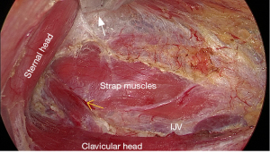 During EBSLN exploration, the exposure of the cricothyroid muscle serves as a confirmation marker. However, in the subclavicular approach, we often use retractors to lift the strap muscle, using the adhesions between the thyroid and strap muscle to pull the thyroid and the lateral central compartment specimen upward symmetrically. If the tissue between the thyroid and strap muscle is separated too early, the thyroid gland may sag downward and hinder the operation, increasing the difficulty of lateral dissection, especially at the entry point into the larynx.