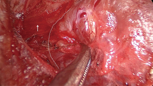 All patients underwent successful endoscopic surgery without conversion to open surgery. EBSLN dissection was performed in 46 of the 48 patients. In two of the patients no EBSLN dissection was completed, attempts were made to identify the nerve, the procedures took approximately 10 minutes each, but the nerve could not be located. To avoid potential damage from further manipulation, further exploration for the nerve was abandoned. Of the dissections, 25 were performed during left thyroidectomy and 23 were performed during right thyroidectomy. Additionally, 42 (87.5%) patients had positive electromyographic signals. Among the patients, 3 were classified as Cernea type 1, 41 as type 2a, and 2 as type 2b (15). Additionally, one patient had a nerve that ran deep to the inferior pharyngeal constrictor muscle (16) (Figure 6).