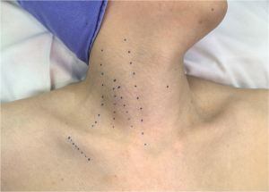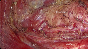 Exclusion criteria were: (I) had preoperative evidence of primary tumor or lymph node invasion into adjacent structures (e.g., the trachea, esophagus, or larynx); (II) had a tumor located close to the entry point of the larynx of the RLN or cricothyroid muscle; (III) preoperative vocal cord paralysis or documented hoarseness; and/or (IV) a known history of keloid formation.