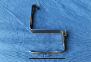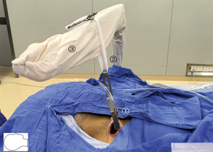 The patient was placed in a supine position with shoulder padding, and their head was slightly turned toward the healthy side. An anesthesia frame was fixed at the midpoint of the apex of the opposite axilla and shoulder to provide a cavity for suspension. An assistant holding the scope was sat at the patient’s head, and the primary surgeon was positioned at the patient’s feet. An instrument table and scrub nurse were also positioned at the patient’s head.